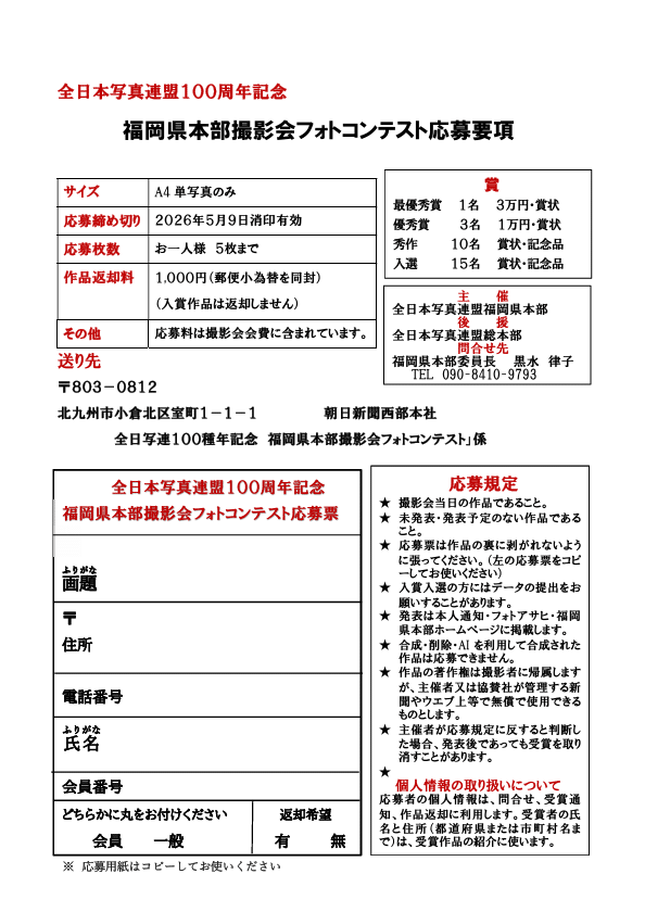◆2026年5月9日消印有効、全日本写真連盟100周年記念 福岡県本部撮影会フォトコンテスト応募要項